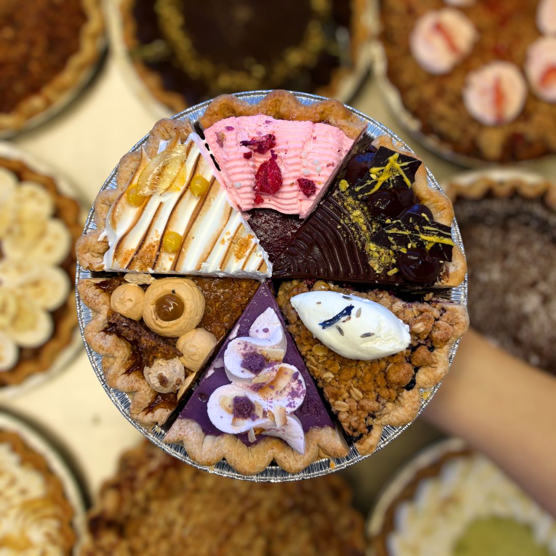 A perfectly Modern Pie pack with a slice of- Dubai Chocolate Pistachio Mousse, Yuzu Lemon Meringue, Ube Coconut , Blueberry Lavender, Salty Caramel Espresso and Raspberry Hibiscus Pie